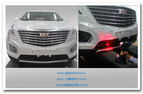 以全局攝影測量系統(tǒng)獲得的標記點數(shù)據(jù)為整體基準,輻射到個別掃描區(qū)域,掃描汽車整車以及部分拆解后的零件,獲取其三維數(shù)據(jù)。