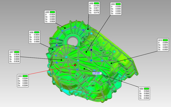 快速準確地獲取了汽車變速箱殼體的3D偏差數(shù)據(jù),準確高效地找到變速箱殼體的誤差,根本上保證了變速箱殼體的生產(chǎn)質量安全。同時大大簡化汽車制造業(yè)零部件的生產(chǎn)質量把控難度,提高檢測的效率,獲得客戶的認可和好評;另一方面,獲取高精度的三維數(shù)據(jù)讓只有合格的變速箱殼體才能裝配進入汽車,大大保證汽車駕駛工作環(huán)境的安全性,為駕駛者保駕護航!